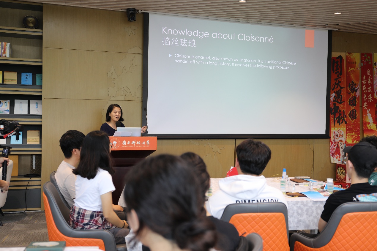 Dr. Zhu Wenhui introduced the Mid-Autumn festival culture, focusing on "tuányuán" (reunion), the festival’s origins, customs, and key terms like " yuèbǐng" (mooncake) and " Zhōngqiū Jié" (Mid-Autumn Festival). Dr. Shen Wei then explained cloisonné, its history, techniques, and related professional terms—to prepare participants for the hands-on part.